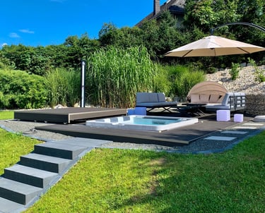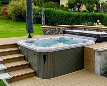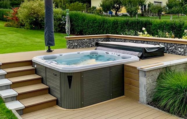 En esta solución, el spa se integra con una estructura auxiliar que permite mayor estabilidad, mejor acabado estético y opciones extra de almacenamiento o recubrimiento. Perfecto para terrazas, jardines y espacios donde se quiera un plus de diseño.