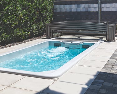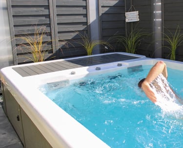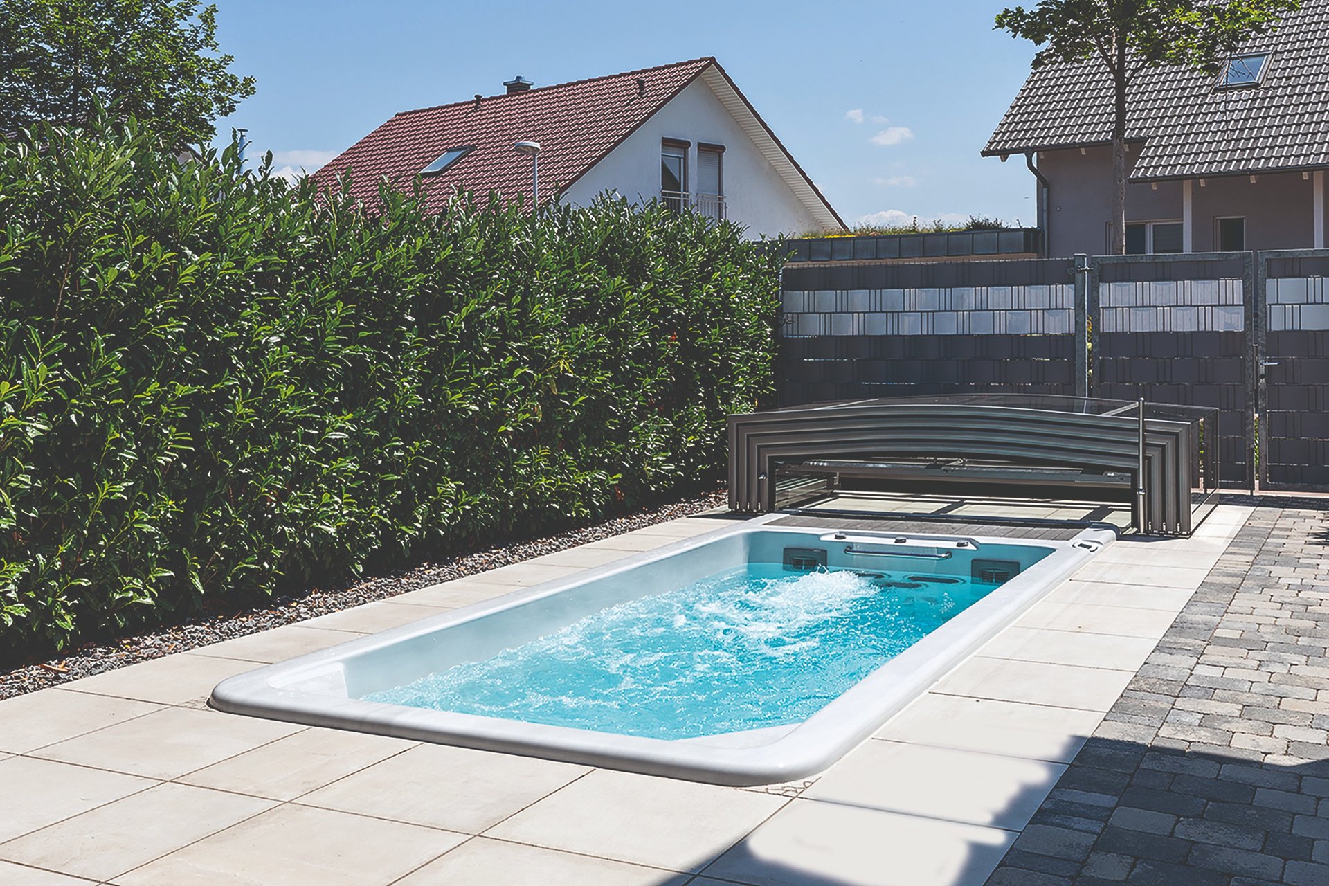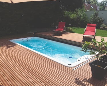 La combinación perfecta de estética y practicidad: un swim spa a ras de suelo con cubierta protectora que asegura durabilidad, limpieza y máxima seguridad.